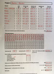 Keeping things simple, you can see that the cost of producing the blanket is £630 for your time plus at least £25 for the materials giving COST £655. This means that you have to charge at least this much to avoid making a loss. The value you calculate for your time is the same as a wage or salary compensating you for your time. Anything you sell the item for on top of this cost is the profit you make. I have put together a worksheet to help you with pricing your project. Here is the free download. I hope you find it helpful. Pricing basics (25854 downloads ) . This is what it looks like completed for a project.